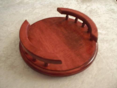 This 12" round lazy susan is constructed of soild cherry wood. It has 5 spindles and a rail on each side, leaving two ends open. This pieces is stained in a custom in house color of ox blood red and sprayed with a pre-catalyzed semi-gloss finish. This lazy susan sits on a 300 pound steel ball bearing swivel. This beautiful lazy susan comes with a set of care instructions so it may add many years of beauty to your home decor.