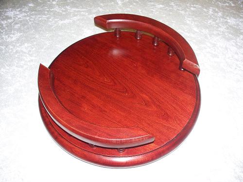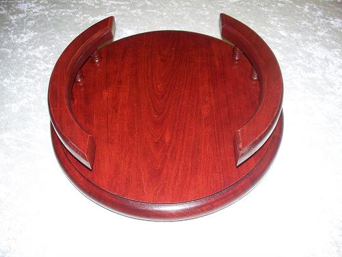 This 12" round lazy susan is constructed from solid cherry wood. This product is stained in a custom in house color called ox blood red and finished with a pre-catalyzed semi-gloss laquer finish. The lazy susan has 5 spindles and a rail on each side, leaving 2 open ends for ease of use and functionality. This piece sits on a 500 pound steel ball bearing swivel. Our products come with their own set of care instructions so that they may add many years of beauty to your home decor.Accessories