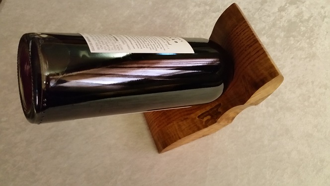 This inverted wine bottle holder was constructed with quartersawn red oak wood in the center and tiger striped spalted maple wood on both sides. This piece was stained with a custom in house color called cinnamon, and sprayed with a semi-gloss lacquer. As with all of our inverted wine bottle holders, this pieces will remain standing with or without the bottle in it.Accessories