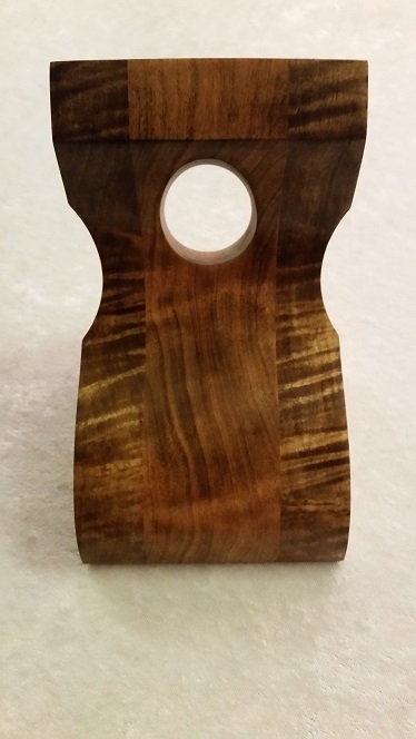 This inverted wine bottle holder is a great gift for any wine enthusiast. This piece was constructed with a solid cherry wood center and tiger striped maple wood on the right and left sides. The piece was stained in a provincial color and finished with a semi gloss lacquer. A set of care instructions is included with your purchase.Accessories
