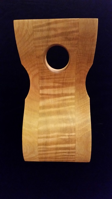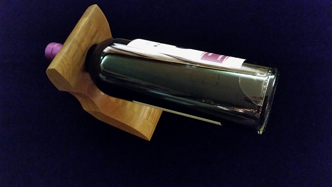 This inverted wine bottle holder was built with a tiger striped maple wood center and accented with quartersawn white oak wood on both sides. The color selected for this piece was a cinnamon and it was finished with a semi gloss lacquer finish. Our inverted wine bottle holders are made to remain standing with or with out a bottle of wine in them. As with all of our products a set of care instructions is included with your purchase for this piece.Accessories