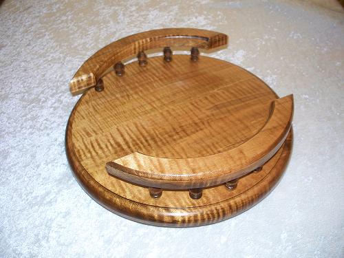 This 12" round lazy susan is constructed from tiger striped maple wood. This piece has 5 spindles and 2 rails on each side leaving two ends open. This piece is stained with Minwax golden oak oil base and is finished with a pre-catalyzed semi-gloss laquer. This lazy susan sits on a 300 pound steel ball bearing swivel. This product comes with a set of care instructions so that it may add years of beauty to your home.