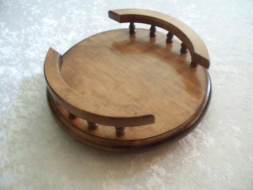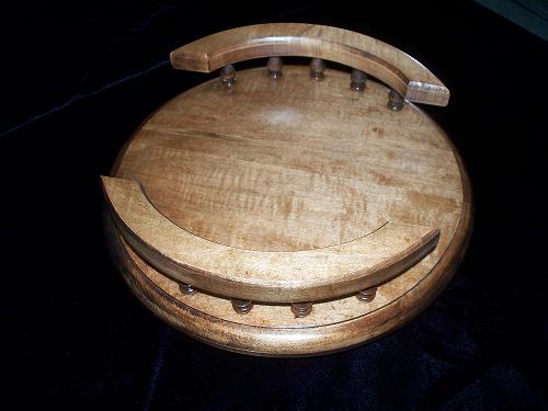 This 12" round lazy susan is constucted from slightly spalted maple wood. This product is finished with a provincial stain and sprayed with a semi gloss laquer. The lazy susan has a total of 10 spindles, 5 on each side, with two rails leaving two ends open. This piece sits on a 500 pound steel ball bearing swivel. Our lazy susans come with there own set of care instructions so that they may bring years of beauty and charm to your home decor.Accessories