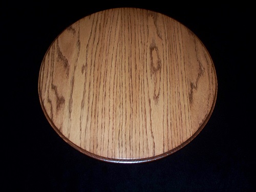 This 14 1/2" lazy susan is constructed from solid red oak wood. This product is stained in a custom made in house red oak color and finished with a pre-catalyzed semi-gloss laquer. This piece sits on a 500 pound steel ball bearing swivel. This lazy susan does come with it's own set of care instructions to guarantee many years of beauty and functionality to your home décor.Accessories